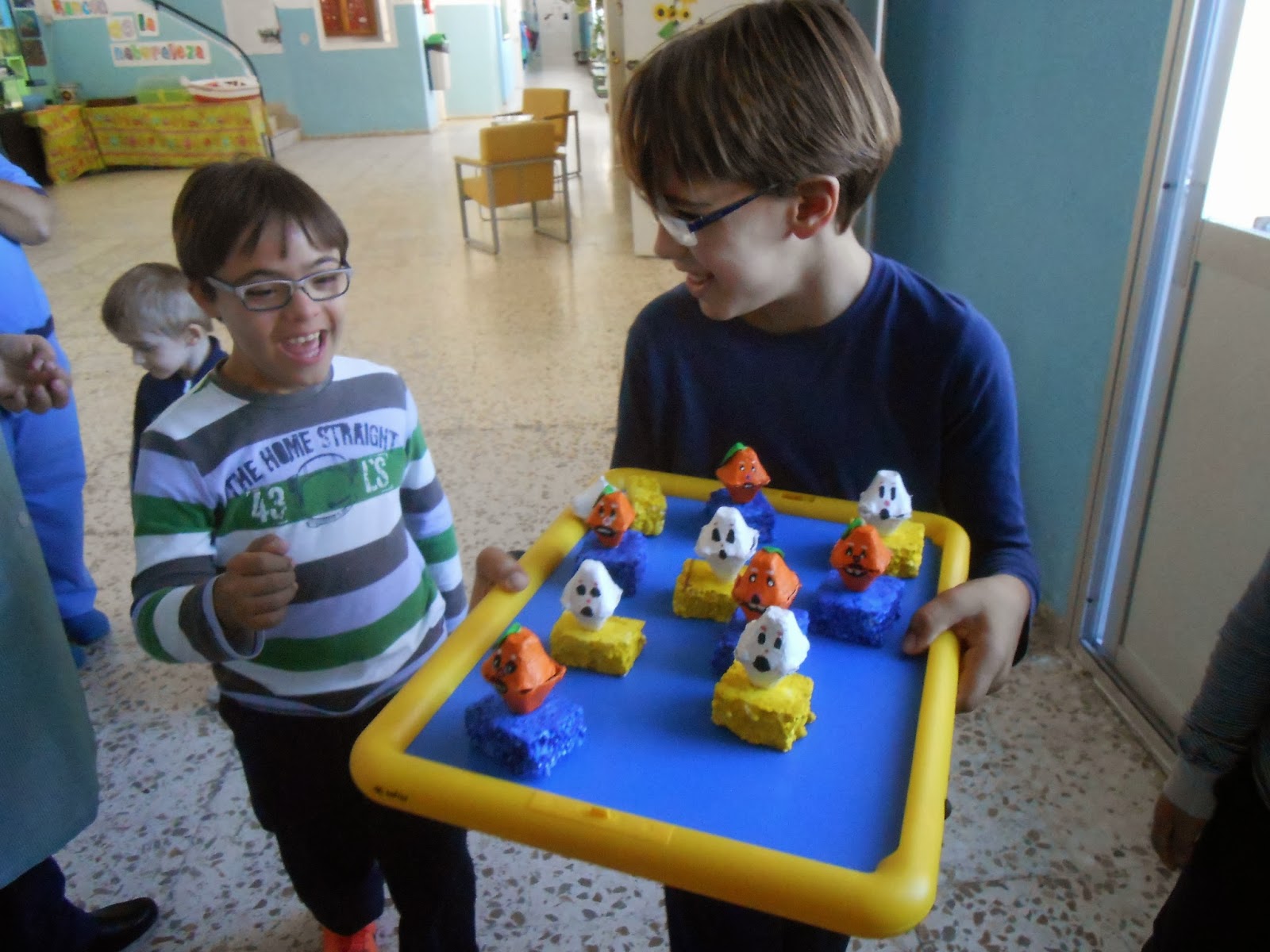 Para celebrar esta festividad, nuestros niños han elaborado unas terroríficas calabazas y simpáticos fantasmitas para decorar sus habitaciones. El proceso ha sido largo y laborioso y todos han participado en la medida de sus posibilidades. Cogimos cartones de huevos y sacamos los moldes para las figuras. Luego, los niños las pintaron con témperas de colores y le dieron una capa de cola para que brillaran. El resultado: muy bonito y colorido.